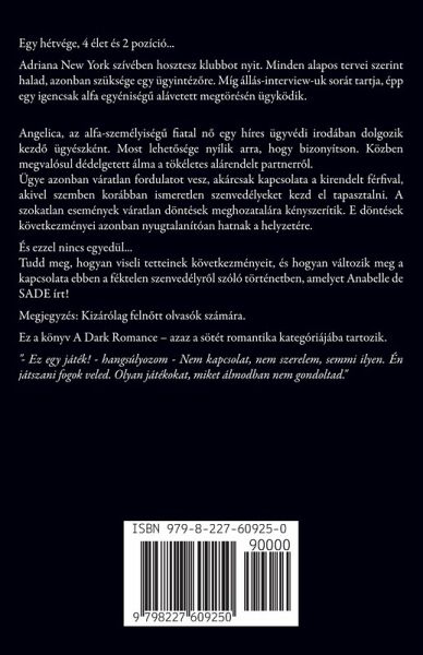 Egy hétvége, 4 élet és 2 pozíció... Adriana New York szívében hosztesz klubbot nyit. Minden alapos tervei szerint halad, azonban szüksége egy ügyintéz¿re. Míg állás-interview-uk sorát tartja, épp egy igencsak alfa egyéniség¿ alávetett megtörésén ügyködik. Angelica, az alfa-személyiség¿ fiatal n¿ egy híres ügyvédi irodában dolgozik kezd¿ ügyészként. Most lehet¿sége nyílik arra, hogy bizonyítson. Közben megvalósul dédelgetett álma a tökéletes alárendelt partnerr¿l. Ügye azonban váratlan fordulatot vesz, akárcsak kapcsolata a kirendelt férfival, akivel szemben korábban ismeretlen szenvedélyeket kezd el tapasztalni. A szokatlan események váratlan döntések meghozatalára kényszerítik. E döntések következményei azonban nyugtalanítóan hatnak a helyzetére. És ezzel nincs egyedül... Tudd meg, hogyan viseli tetteinek következményeit, és hogyan változik meg a kapcsolata ebben a féktelen szenvedélyr¿l szóló történetben, amelyet Anabelle de SADE írt! Megjegyzés: Kizárólag feln¿tt olvasók számára. Ez a könyv A Dark Romance - azaz a sötét romantika kategóriájába tartozik. "- Ez egy játék! - hangsúlyozom - Nem kapcsolat, nem szerelem, semmi ilyen. Én játszani fogok veled. Olyan játékokat, miket álmodban nem gondoltad."