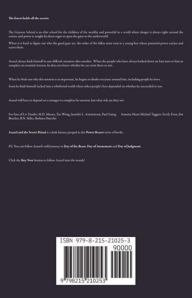 The forest holds all the secrets The Grayson School is an elite school for the children of the wealthy and powerful in a world where danger is always right around the corner, and power is sought by those eager to open the gates to the underworld. When it is hard to figure out who the good guys are, the order of the fallen must turn to a young boy whose potential power excites and scares them. Azazel always finds himself in one difficult situation after another. When the people who have always looked down on him turn to him to complete an essential mission, he does not know whether he can trust them or not. When he finds out why this mission is so important, he begins to doubt everyone around him, including people he loves. Soon he finds himself sucked into a whirlwind world where other people's lives depended on whether he succeeded or not. Azazel will have to depend on a stranger to complete his mission, but what side are they on? For fans of Liv Zander, M.D. Massey, Tao Wong, Jennifer L. Armentrout, Paul Sating Annette Marie Michael Taggart, Everly Frost, Jim Butcher, B.N. Miles, Barbara Hartzler Azazel and the Secret Ritual is a dark fantasy prequel to the Power Bearer series of books. P.S. You can follow Azazel's wild journey in Day of the Beast, Day of Atonement and Day of Judgment. Click the Buy Now button to follow Azazel into the woods!