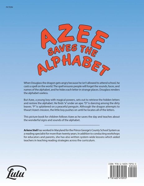 When Douglass the dragon gets angry because he isn't allowed to attend school, he casts a spell on the world. The spell ensures people will forget the sounds, faces, and names of the alphabet, and he hides each letter in strange places. Douglass renders the alphabet useless. But Azee, a young boy with magical powers, sets out to retrieve the hidden letters and restore the alphabet. He finds "a" under an ape. "D" is dancing among the dirty leaves. "P" is splattered on a peaceful penguin. Although the dragon attempts to thwart Azee's mission, the little boy pushes on until he locates all of the letters. This picture book for children follows Azee as he saves the day and teaches about the wonderful signs and sounds of the alphabet.