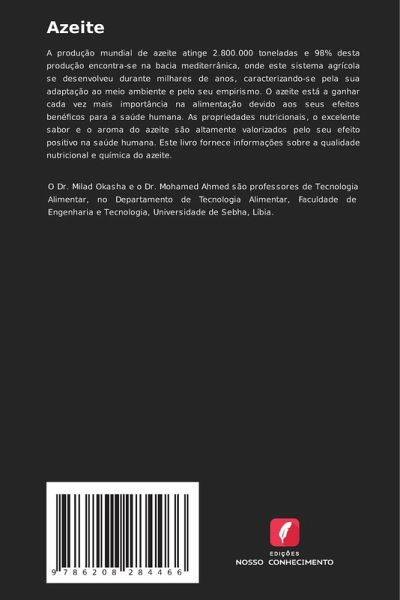 A produção mundial de azeite atinge 2.800.000 toneladas e 98% desta produção encontra-se na bacia mediterrânica, onde este sistema agrícola se desenvolveu durante milhares de anos, caracterizando-se pela sua adaptação ao meio ambiente e pelo seu empirismo. O azeite está a ganhar cada vez mais importância na alimentação devido aos seus efeitos benéficos para a saúde humana. As propriedades nutricionais, o excelente sabor e o aroma do azeite são altamente valorizados pelo seu efeito positivo na saúde humana. Este livro fornece informações sobre a qualidade nutricional e química do azeite.