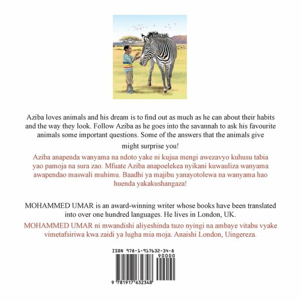 Aziba loves animals and his dream is to find out as much as he can about their habits and the way they look. Follow Aziba as he goes into the savannah to ask his favourite animals some important questions. Some of the answers that the animals give might surprise you! Aziba anapenda wanyama na ndoto yake ni kujua mengi awezavyo kuhusu tabia yao pamoja na sura zao. Mfuate Aziba anapoelekea nyikani kuwauliza wanyama awapendao maswali muhimu. Baadhi ya majibu yanayotolewa na wanyama hao huenda yakakushangaza!