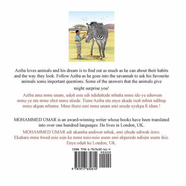Aziba loves animals and his dream is to find out as much as he can about their habits and the way they look. Follow Aziba as he goes into the savannah to ask his favourite animals some important questions. Some of the answers that the animals give might surprise you! Aziba ama mme unam, ud¿ñ esie edi ndiduñ¿de mbaña mme ido ye eduwem mm¿ ye nte mme obot mm¿ etiede. Tiene Aziba nte enye akade is¿ñ mbiet ndibup mm¿ akpan mbume. Mme ib¿r¿ emi mme unam emi en¿de eyekpa fi idem.