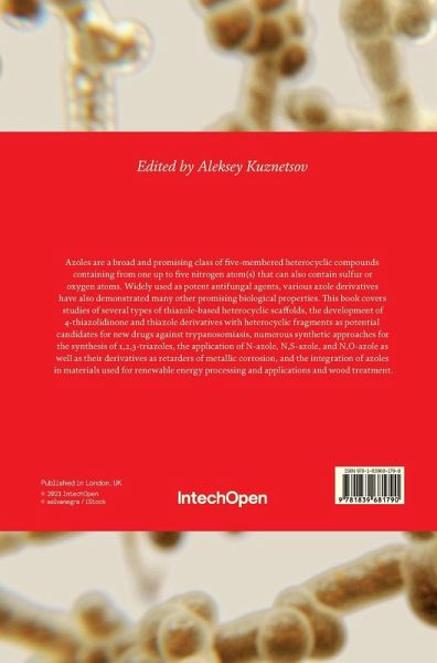 Azoles are a broad and promising class of five-membered heterocyclic compounds containing from one up to five nitrogen atom(s) that can also contain sulfur or oxygen atoms. Widely used as potent antifungal agents, various azole derivatives have also demonstrated many other promising biological properties. This book covers studies of several types of thiazole-based heterocyclic scaffolds, the development of 4-thiazolidinone and thiazole derivatives with heterocyclic fragments as potential candidates for new drugs against trypanosomiasis, numerous synthetic approaches for the synthesis of 1,2,3-triazoles, the application of N-azole, N,S-azole, and N,O-azole as well as their derivatives as retarders of metallic corrosion, and the integration of azoles in materials used for renewable energy processing and applications and wood treatment.
