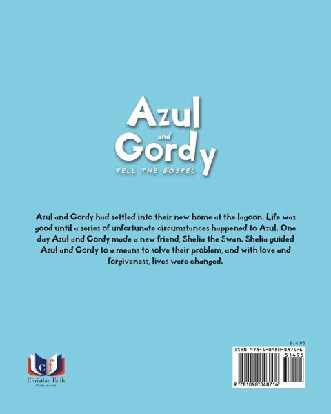 Azul and Gordy had settled into their new home at the lagoon. Life was good until a series of unfortunate circumstances happened to Azul. One day Azul and Gordy made a new friend, Shelia the Swan. Shelia guided Azul and Gordy to a means to solve their problem, and with love and forgiveness, lives were changed.