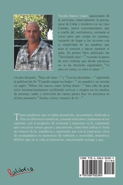 Nicolás Ramos López apasionado de la escritura, especialmente la poesía, natal de Cuba y residente en las islas Caimán, poeta contemporáneo que a confín del sentimiento, estimula al verso para que surjan los poemas, tratando de llegar a los lectores con la simplicidad de las palabras que atan al corazón y hacen suspirar el alma. Su primer libro publicado fue "Destilando miel..." rozando la punta de este iceberg que desde entonces no se ha detenido siguiéndole "Te amo en verso, te curo el alma..." Un año después, "Rayo de luna..." y "Lluvias desnudas..." siguiendo la publicación de "Cuando caigan las hojas..." en español y su versión en inglés "When the leaves come folling down..." han sido de gran éxito internacionalmente recibiendo críticas y elogios en los medios de prensas, radio y televisión de varios países hoy les presenta su último poemario "Azules cielos, renacer de fe..."