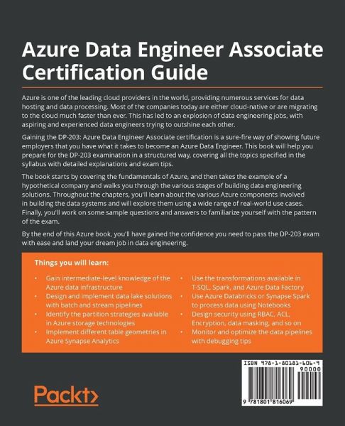 Become well-versed with data engineering concepts and exam objectives to achieve Azure Data Engineer Associate certification Key Features:Understand and apply data engineering concepts to real-world problems and prepare for the DP-203 certification exam Explore the various Azure services for building end-to-end data solutions Gain a solid understanding of building secure and sustainable data solutions using Azure services Book Description: Azure is one of the leading cloud providers in the world, providing numerous services for data hosting and data processing. Most of the companies today are either cloud-native or are migrating to the cloud much faster than ever. This has led to an explosion of data engineering jobs, with aspiring and experienced data engineers trying to outshine each other. Gaining the DP-203: Azure Data Engineer Associate certification is a sure-fire way of showing future employers that you have what it takes to become an Azure Data Engineer. This book will help you prepare for the DP-203 examination in a structured way, covering all the topics specified in the syllabus with detailed explanations and exam tips. The book starts by covering the fundamentals of Azure, and then takes the example of a hypothetical company and walks you through the various stages of building data engineering solutions. Throughout the chapters, you'll learn about the various Azure components involved in building the data systems and will explore them using a wide range of real-world use cases. Finally, you'll work on sample questions and answers to familiarize yourself with the pattern of the exam. By the end of this Azure book, you'll have gained the confidence you need to pass the DP-203 exam with ease and land your dream job in data engineering. What You Will Learn:Gain intermediate-level knowledge of Azure the data infrastructure Design and implement data lake solutions with batch and stream pipelines Identify the partition strategies available in Azure storage technologies Implement different table geometries in Azure Synapse Analytics Use the transformations available in T-SQL, Spark, and Azure Data Factory Use Azure Databricks or Synapse Spark to process data using Notebooks Design security using RBAC, ACL, encryption, data masking, and more Monitor and optimize data pipelines with debugging tips Who this book is for: This book is for data engineers who want to take the DP-203: Azure Data Engineer Associate exam and are looking to gain in-depth knowledge of the Azure cloud stack. The book will also help engineers and product managers who are new to Azure or interviewing with companies working on Azure technologies, to get hands-on experience of Azure data technologies. A basic understanding of cloud technologies, extract, transform, and load (ETL), and databases will help you get the most out of this book.