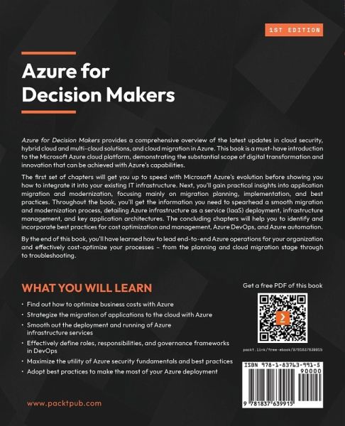 Develop expertise in Azure to plan, guide, and lead a streamlined modernization process Key Features: Explore core Azure infrastructure technologies and solutions Achieve smooth app migration and modernization goals with cloud design Master Azure architecture and adopt it to scale your business globally Purchase of the print or Kindle book includes a free PDF eBook Book Description: Azure for Decision Makers provides a comprehensive overview of the latest updates in cloud security, hybrid cloud and multi-cloud solutions, and cloud migration in Azure. This book is a must-have introduction to the Microsoft Azure cloud platform, demonstrating the substantial scope of digital transformation and innovation that can be achieved with Azure's capabilities. The first set of chapters will get you up to speed with Microsoft Azure's evolution before showing you how to integrate it into your existing IT infrastructure. Next, you'll gain practical insights into application migration and modernization, focusing mainly on migration planning, implementation, and best practices. Throughout the book, you'll get the information you need to spearhead a smooth migration and modernization process, detailing Azure infrastructure as a service (IaaS) deployment, infrastructure management, and key application architectures. The concluding chapters will help you to identify and incorporate best practices for cost optimization and management, Azure DevOps, and Azure automation. By the end of this book, you'll have learned how to lead end-to-end Azure operations for your organization and effectively cost-optimize your processes ¿ from the planning and cloud migration stage through to troubleshooting. What You Will Learn: Find out how to optimize business costs with Azure Strategize the migration of applications to the cloud with Azure Smooth out the deployment and running of Azure infrastructure services Effectively define roles, responsibilities, and governance frameworks in DevOps Maximize the utility of Azure security fundamentals and best practices Adopt best practices to make the most of your Azure deployment Who this book is for: Azure for Decision Makers is for business and IT decision makers who want to choose the right technology solutions for their businesses and optimize their management processes. It'll help you develop expertise in operating and administering the Azure cloud. This book will also be useful for CIOs and CTOs looking to understand more about how IT can make their business infrastructure more efficient and easier to use, which will reduce friction within their organization. Knowledge of Azure is helpful, but not necessary to get the most out of this guide.