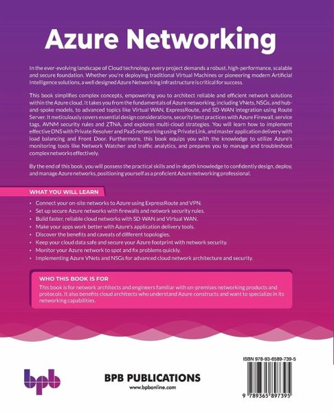 DESCRIPTION In the ever-evolving landscape of Cloud technology, every project demands a robust, high-performance, scalable and secure foundation. Whether you're deploying traditional Virtual Machines or pioneering modern Artificial Intelligence solutions, a well designed Azure Networking infrastructure is critical for success. This book simplifies complex concepts, empowering you to architect reliable and efficient network solutions within the Azure cloud. It takes you from the fundamentals of Azure networking, including VNets, NSGs, and hub-and-spoke models, to advanced topics like Virtual WAN, ExpressRoute, and SD-WAN integration using Route Server. It meticulously covers essential design considerations, security best practices with Azure Firewall, service tags, AVNM security rules and ZTNA, and explores multi-cloud strategies. You will learn how to implement effective DNS with Private Resolver and PaaS networking using Private Link, and master application delivery with load balancing and Front Door. Furthermore, this book equips you with the knowledge to utilize Azure's monitoring tools like Network Watcher and traffic analytics, and prepares you to manage and troubleshoot complex networks effectively. By the end of this book, you will possess the practical skills and in-depth knowledge to confidently design, deploy, and manage Azure networks, positioning yourself as a proficient Azure networking professional. WHAT YOU WILL LEARN ¿ Connect your on-site networks to Azure using ExpressRoute and VPN. ¿ Set up secure Azure networks with firewalls and network security rules. ¿ Build faster, reliable cloud networks with SD-WAN and Virtual WAN. ¿ Make your apps work better with Azure's application delivery tools. ¿ Discover the benefits and caveats of different topologies. ¿ Keep your cloud data safe and secure your Azure footprint with network security. WHO THIS BOOK IS FOR This book is for network architects and engineers familiar with on-premises networking products and protocols. It also benefits cloud architects who understand Azure constructs and want to specialize in its networking capabilities.