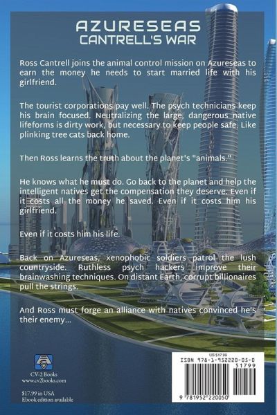 Ross Cantrell joins the animal control mission on Azureseas to earn the money he needs to start married life with his girlfriend. The tourist corporations pay well. The psych technicians keep his brain focused. Neutralizing the large, dangerous native lifeforms is dirty work, but necessary to keep people safe. Like plinking tree cats back home. Then Ross learns the truth about the planet's "animals." He knows what he must do. Go back to the planet and help the intelligent natives get the compensation they deserve. Even if it costs all the money he saved. Even if it costs him his girlfriend. Even if it costs him his life. Back on Azureseas, xenophobic soldiers patrol the lush countryside. Ruthless psych hackers improve their brainwashing techniques. On distant Earth, corrupt billionaires pull the strings. And Ross must forge an alliance with natives convinced he's their enemy...