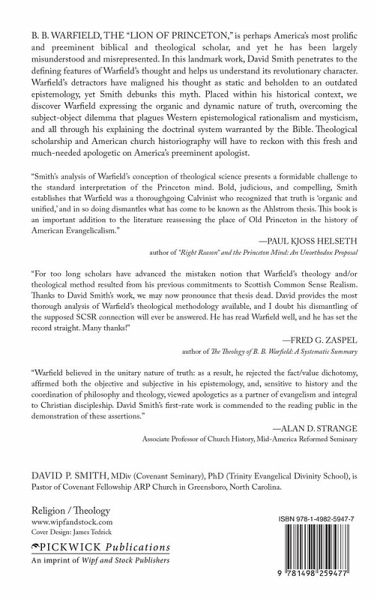 B. B. Warfield, the "Lion of Princeton," is perhaps America's most prolific and preeminent biblical and theological scholar, and yet he has been largely misunderstood and misrepresented. In this landmark work, David Smith penetrates to the defining features of Warfield's thought and helps us understand its revolutionary character. Warfield's detractors have maligned his thought as static and beholden to an outdated epistemology, yet Smith debunks this myth. Placed within his historical context, we discover Warfield expressing the organic and dynamic nature of truth, overcoming the subject-object dilemma that plagues Western epistemological rationalism and mysticism, and all through his explaining the doctrinal system warranted by the Bible. Theological scholarship and American church historiography will have to reckon with this fresh and much-needed apologetic on America's preeminent apologist.