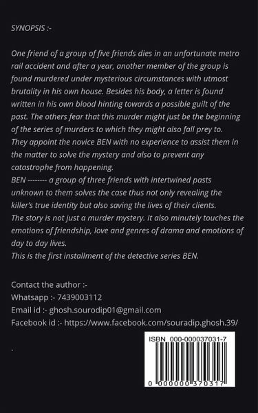 One friend of a group of five friends dies in an unfortunate metro rail accident and after a year, another member of the group is found murdered under mysterious circumstances with utmost brutality in his own house. Besides his body, a letter is found written in his own blood hinting towards a possible guilt of the past. The others fear that this murder might just be the beginning of the series of murders to which they might also fall prey to. They appoint the novice BEN with no experience to assist them in the matter to solve the mystery and also to prevent any catastrophe from happening. BEN -------- a group of three friends with intertwined pasts unknown to them solves the case thus not only revealing the killer’s true identity but also saving the lives of their clients. The story is not just a murder mystery. It also minutely touches the emotions of friendship, love and genres of drama and emotions of day to day lives. This is the first installment of the detective series BEN.