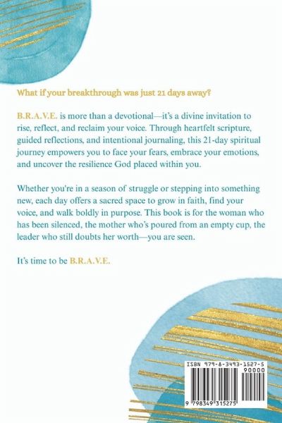 B.R.A.V.E: A 21-Day Spiritual Journey to Building Resilience and Voicing Emotions is a powerful devotional designed to guide readers through a transformative path of healing, self-discovery, and spiritual growth. Rooted in the B.R.A.V.E. framework-Building Resilience And Voicing Emotions-this journey offers daily scriptures, reflections, and journal prompts to help you confront challenges with courage, express your truth, and embrace the strength God has placed within you. Whether you're navigating pain, seeking purpose, or simply longing for peace, this 21-day experience will nurture your spirit and remind you: bravery doesn't mean being fearless-it means showing up faithfully, even when it's hard. Step into a journey of healing, strength, and self-discovery. B.R.A.V.E. invites you to confront fear with faith, embrace your emotions with honesty, and uncover the resilience God placed inside you. Through daily devotionals, guided prayers, affirmations, and interactive reflections, you'll learn that bravery isn't about being fearless-it's about showing up, speaking out, and trusting God through it all. Let this be your season to rise, rebuild, and boldly become everything you were created to be.