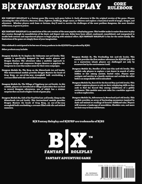 B X Fantasy Roleplay is the ultimate B/X emulator. Based on the 1981 B/X rules, edited by Tom Moldvay, Dave Cook, and Steve Marsh, this booklet consolidates the Basic and Expert Sets into one, easy-to-use booklet. So buy a backpack, light a torch, steady your steed, and wield the B XFRP rules for an action-pack, exciting evening of fun and adventure, old-school style.