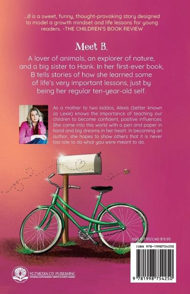...B is a sweet, funny, thought-provoking story designed to model a growth mindset and life lessons for young readers. -The Children's Book Review Meet B. A lover of animals, an explorer of nature, and a big sister to Hank. In her first-ever book, B tells stories of how she learned some of life's very important lessons, just by being her regular ten-year-old self. As a mother to two kiddos, Alexis (better known as Lexie) knows the importance of teaching our children to become confident, positive influences. She came into this world with a pen and paper in hand and big dreams in her heart. In becoming an author, she hopes to show others that it is never too late to do what you were meant to do.