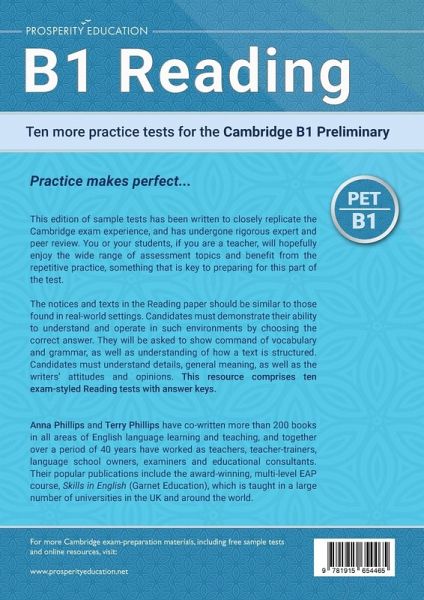 Practice makes perfect... This edition of sample tests has been written to closely replicate the Cambridge exam experience, and has undergone rigorous expert and peer review. You or your students, if you are a teacher, will hopefully enjoy the wide range of assessment topics and benefit from the repetitive practice, something that is key to preparing for this part of the test. The notices and texts in the Reading paper should be similar to those found in real-world settings. Candidates must demonstrate their ability to understand and operate in such environments by choosing the correct answer. They will be asked to show command of vocabulary and grammar, as well as understanding of how a text is structured. Candidates must understand details, general meaning, as well as the writers' attitudes and opinions. This resource comprises ten exam-styled Reading tests with answer keys. Anna Phillips and Terry Phillips have co-written more than 200 books in all areas of English language learning and teaching, and together over a period of 40 years have worked as teachers, teacher-trainers, language school owners, examiners and educational consultants. Their popular publications include the award-winning, multi-level EAP course, Skills in English (Garnet Education), which is taught in a large number of universities in the UK and around the world. For more Cambridge English resources, visit www.prosperityeducation.net