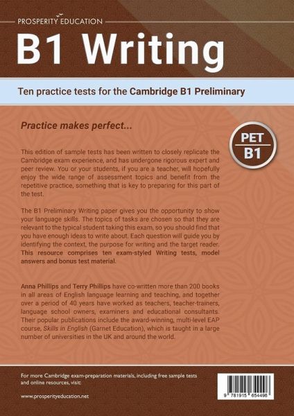 Practice makes perfect... This edition of sample tests has been written to closely replicate the Cambridge exam experience, and has undergone rigorous expert and peer review. You or your students, if you are a teacher, will hopefully enjoy the wide range of assessment topics and benefit from the repetitive practice, something that is key to preparing for this part of the test. The B1 Preliminary Writing paper gives you the opportunity to show your language skills. The topics of tasks are chosen so that they are relevant to the typical student taking this exam, so you should find that you have enough ideas to write about. Each question will guide you by identifying the context, the purpose for writing and the target reader. This resource comprises ten exam-styled Writing tests, model answers and bonus test material. Anna Phillips and Terry Phillips have co-written more than 200 books in all areas of English language learning and teaching, and together over a period of 40 years have worked as teachers, teacher-trainers, language school owners, examiners and educational consultants. Their popular publications include the award-winning, multi-level EAP course, Skills in English (Garnet Education), which is taught in a large number of universities in the UK and around the world. For more Cambridge English resources, visit www.prosperityeducation.net