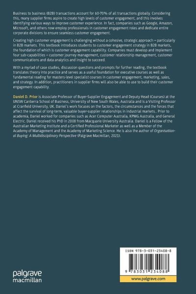 With a myriad of case studies, discussion questions and prompts forfurther reading, the textbook translates theory into practice and serves as a useful foundation for executive courses as well as fundamental reading for masters-level specialist courses in customer engagement, marketing, sales, and strategy. In addition, practitioners in supplier firms will also be able to use to build their customer engagement capability.