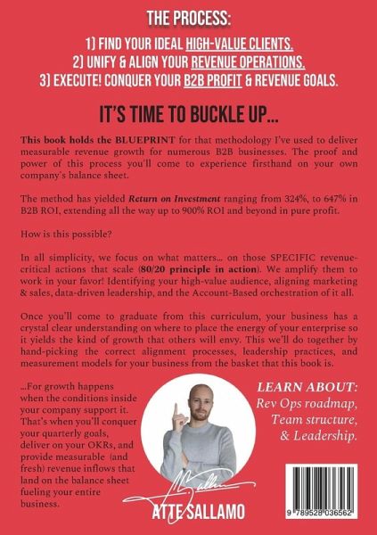 This book holds the BLUEPRINT for that methodology I've used to deliver measurable revenue growth for numerous B2B businesses.This method has yielded Return on Investment ranging from 324%, to 647% in B2B ROI, all the way up to 900% and beyond in pure profit.What I am describing here is not an alien result, but one your B2B company gets to experience (and should expect) once you get in place this framework that awaits you inside these covers.The process:1) Find your ideal high-value clients.2) UNIFY & ALIGN your revenue operations.3) EXECUTE! Conquer your B2B profit & REVENUE GOALS.The proof and power of this process you'll come to experience firsthand on your own company's balance sheet.How is this possible?In all simplicity, we focus on what matters. on those SPECIFIC revenue-critical actions that scale (80/20 principle in action). We amplify them to work in your favor! Identifying your high-value audience, aligning marketing & sales, data-driven leadership, and the Account-Based orchestration of it all.Once you'll come to graduate from this curriculum, your business has a crystal clear understanding on where to place the energy of your enterprise so it yields the kind of growth that others will envy. This we'll do together by hand-picking the correct alignment processes, leadership practices, and measurement models for your business from the basket that this book is....For growth happens when the conditions inside your company support it. That's when you'll conquer your quarterly goals, deliver on your OKRs, and provide measurable (and fresh) revenue inflows that land on the balance sheet fueling your entire business.LEARN ABOUT:Rev Ops roadmap,Team structure, & Leadership.