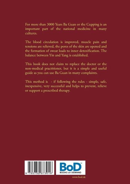 For more than 3000 Years Ba Guan or the Cupping is an important part of the national medicine in many cultures.The blood circulation is improved, muscle pain and tensions are relieved, the pores of the skin are opened and the formation of sweat leads to inner detoxification. The balance between Yin and Yang is established.This book does not claim to replace the doctor or the non-medical practitioner, but it is a simple and useful guide as you can use Ba Guan in many complaints.This method is - if following the rules - simple, safe, inexpensive, very successful and helps to prevent, relieve or support a prescribed therapy.