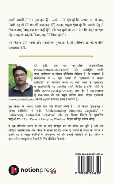 Reading good poetry typically gives you one of the three feelings - a "feeling of release" because you feel that the poet has given words to your deeply-held unexpressed feelings; a "feeling of companionship" because the expression makes you feel that there is someone who knows exactly what you are going through; a "feeling of clarity" because you feel that you have found the answers to the questions you are grappling with. This book is a collection of Nazms and Ghazals that will surely leave you with more than one of these three feelings.