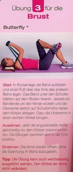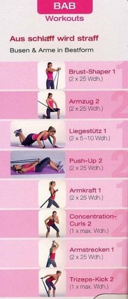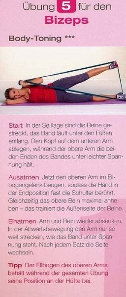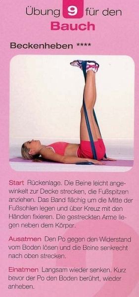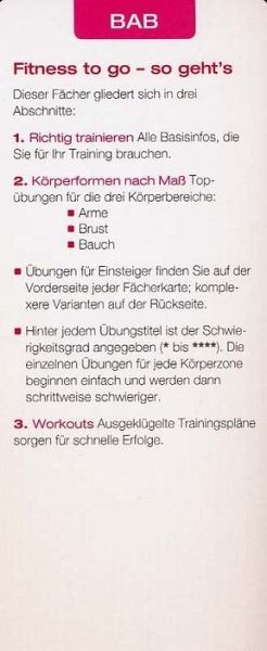 Das Workout-Programm ist der optimale Begleiter für unterwegs. Auf jeder Karte wird eine Übung in aller Deutlichkeit gezeigt und erklärt. Auf der Kartenrückseite werden Varianten oder Tipps zur korrekten Ausführung vorgestellt.Das Workout für Arme, Busen und Bauch bietet unterschiedliche Leistungsstufen für Einsteiger und Fortgeschrittene. Die Varianten fördern neben der Kraft auch die Balance und Beweglichkeit. Bei regelmäßigem Training wird Muskelmasse aufgebaut und die Fettdepots schmelzen, der Oberkörper wird straffer und bekommt wieder Konturen. Ganz nebenbei verbessert sich die Haltung und damit die persönliche Ausstrahlung. Für die Übungen benötigt man nur noch ein Theraband und kann jederzeit und fast überall mit einem kleinen Blitz-Workout an seiner Traumfigur arbeiten!