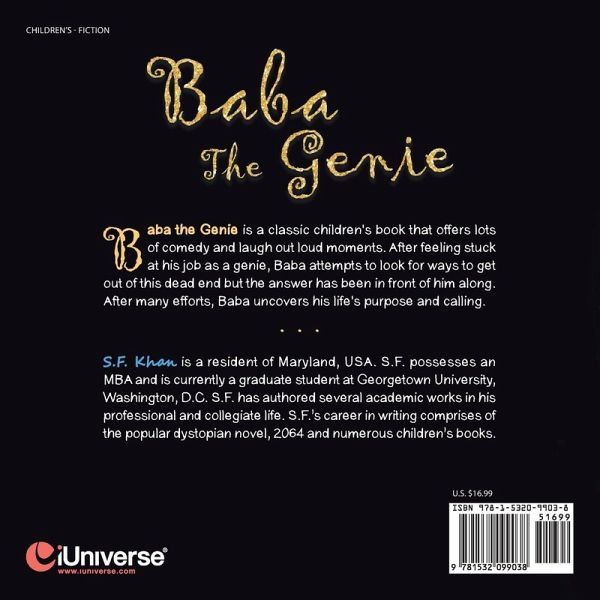 Baba the Genie is a classic children's book that offers lots of comedy and laugh out loud moments. After feeling stuck at his job as a genie, Baba attempts to look for ways to get out of this dead end but the answer has been in front of him along. After many efforts, Baba uncovers his life's purpose and calling.