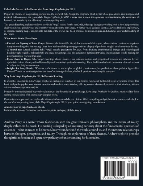 Unlock the Secrets of the Future with Baba Vanga Prophecies for 2025 Prepare to embark on a captivating journey into the world of Baba Vanga, the enigmatic blind mystic whose predictions have intrigued and inspired millions across the globe. Baba Vanga Prophecies for 2025 is more than a book; it's a gateway to understanding the crossroads of humanity as foretold by one of history's most compelling seers. This groundbreaking exploration delves into Baba Vanga's visions for the year 2025, offering a thought-provoking look at how her prophecies align with current global events and what they reveal about the path ahead. Whether you're a curious skeptic, a devoted follower of prophecy, or someone seeking deeper insights into the state of the world, this book promises to inform, inspire, and challenge your understanding of the future. What Awaits You in These PagesUnravel the Mystery of Baba Vanga: Discover the incredible life of this renowned clairvoyant, whose visions continue to captivate imaginations long after her passing. Learn how her humble beginnings gave rise to a legacy of profound insights into humanity's destiny. A Pivotal Year Ahead: Explore Baba Vanga's specific predictions for 2025, from dramatic environmental changes and technological breakthroughs to global political shifts and social awakenings. This book examines her foresight with a lens on current trends, making her prophecies more relevant than ever. From Chaos to Hope: Baba Vanga's warnings about climate crises, misinformation, and geopolitical tensions are balanced by her optimistic visions of unity, ethical leadership, and humanity's spiritual awakening. These dualities offer both cautionary tales and reasons to believe in a brighter tomorrow. Insights for Every Reader: Whether you're drawn to her insights on global consciousness, her predictions about political figures like Donald Trump, or her foresight into the rise of technological ethics, this book provides something for everyone. Why Baba Vanga Prophecies for 2025 Is Essential Reading In a world of uncertainty, Baba Vanga's prophecies challenge us to reflect on our choices, values, and the kind of future we want to create. This book bridges the gap between ancient intuition and modern understanding, offering readers a balanced perspective that blends mysticism, science, and contemporary analysis. Perfect for anyone fascinated by prophecy, history, or the dynamics of global change, Baba Vanga Prophecies for 2025 is a must-read for those seeking to make sense of an increasingly complex world. Don't miss the opportunity to explore the visions that have stood the test of time. With compelling analysis, historical context, and a look at the world's most pressing issues, Baba Vanga Prophecies for 2025 is your guide to navigating the unknown. Available now in paperback, and ebook. Embrace the wisdom. Prepare for the future. Step into the legacy of Baba Vanga.