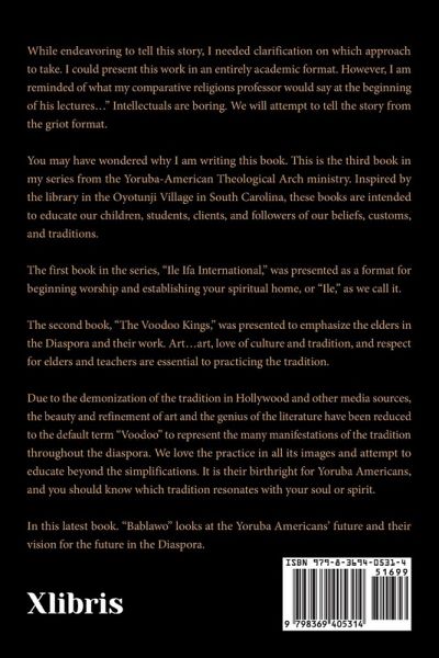 While endeavoring to tell this story, I needed clarification on which approach to take. I could present this work in an entirely academic format. However, I am reminded of what my comparative religions professor would say at the beginning of his lectures..." Intellectuals are boring. We will attempt to tell the story from the griot format. You may have wondered why I am writing this book. This is the third book in my series from the Yoruba-American Theological Arch ministry. Inspired by the library in the Oyotunji Village in South Carolina, these books are intended to educate our children, students, clients, and followers of our beliefs, customs, and traditions. The first book in the series, "Ile Ifa International," was presented as a format for beginning worship and establishing your spiritual home, or "Ile," as we call it. The second book, "The Voodoo Kings," was presented to emphasize the elders in the Diaspora and their work. Art...art, love of culture and tradition, and respect for elders and teachers are essential to practicing the tradition. Due to the demonization of the tradition in Hollywood and other media sources, the beauty and refinement of art and the genius of the literature have been reduced to the default term "Voodoo" to represent the many manifestations of the tradition throughout the diaspora. We love the practice in all its images and attempt to educate beyond the simplifications. It is their birthright for Yoruba Americans, and you should know which tradition resonates with your soul or spirit. In this latest book. "Bablawo" looks at the Yoruba Americans' future and their vision for the future in the Diaspora.