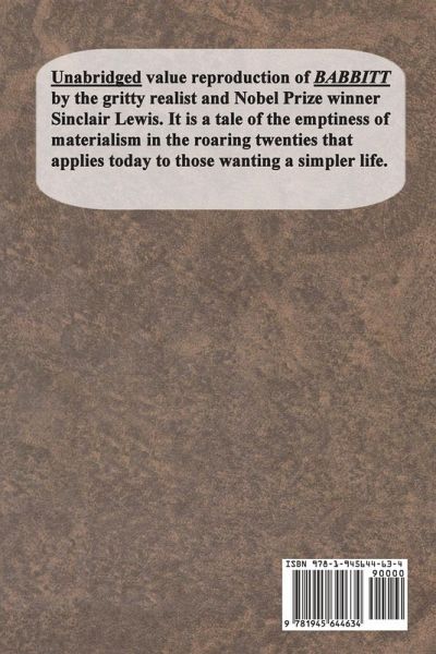 Unabridged value reproduction of BABBITT by the gritty realist and Nobel Prize winner Sinclair Lewis. It is a tale of the emptiness of materialism in the roaring twenties that applies today to those wanting a simpler life. The hero is Babbitt, ruling his business with militant normalcy and also the most grievous victim of his own militant dullness. Lewis describes it this way, "He is all of us Americans at 46, prosperous but worried, wanting - passionately - to seize something more than motor cars and a house before it's too late."