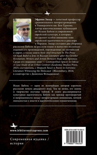ENG Efraim Sicher (PhD Hebrew University) is a full professor at Ben-Gurion University, where he teaches comparative literature. He has published a study of Isaac Babel's prose style, Style and Structure in the Prose of Isaak Babel (Slavica, 1986), has edited two volumes of Babel's stories in Russian and one in English, and has edited the complete works of Babel in Hebrew. He has also published numerous books and articles in Russian and comparative literature and is well known in the field of modern Jewish culture. RUS Эфраим Зихер является почетным профессором сравнительного литературоведения в Университете им. Д. Бен-Гуриона в Негеве, Израиль. Он является автором многочисленных публикаций об Исааке Бабеле и современной еврейской культуре, уделяя особое внимание еврейской идентичности в диаспоре и Израиле после Холокоста. Он издал два тома рассказов Бабеля на русском языке и переводы его произведений на английский и иврит, а также написал книги 'Стиль и структура в прозе Исаака Бабеля' (Slavica Publishers, 1986) и 'Евреи в русской литературе после Октябрьской революции писатели и художники между отступничеством и надеждой' (Cambridge University Press, 1995). Среди его недавних книг -- (ред. с Мирьей Леке) 'Космополитические пространства в Одессе тематическое исследование городского контекста' (Academic Studies Press, 2023) и (в соавторстве с Даниэлем Фельдманом) 'Поэзис в экстремальных условиях литература, свидетельствующая о Холокосте' (Bloomsbury, 2024).