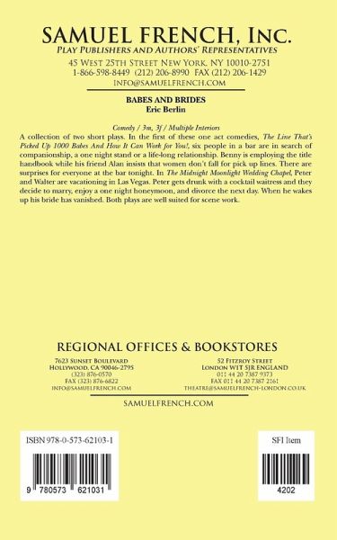 A collection of two short plays. In the first of these one act comedies, The Line Thats Picked Up 1000 Babes And How It Can Work for You, six people in a bar are in search of companionship, a one night stand or a life-long relationship. Benny is employing the title handbook while his friend Alan insists that women dont fall for pick up lines. There are surprises for everyone at the bar tonight. In The Midnight Moonlight Wedding Chapel, Peter and Walter are vacationing in Las Vegas. Peter gets drunk with a cocktail waitress and they decide to marry, enjoy a one night honeymoon, and divorce the next day. When he wakes up his bride has vanished. Both plays are well suited for scene work.