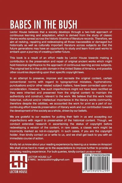 Babes In The Bush This book is a result of an effort made by us towards making a contribution to the preservation and repair of original classic literature. In an attempt to preserve, improve and recreate the original content, we have worked towards: 1. Type-setting & Reformatting: The complete work has been re-designed via professional layout, formatting and type-setting tools to re-create the same edition with rich typography, graphics, high quality images, and table elements, giving our readers the feel of holding a 'fresh and newly' reprinted and/or revised edition, as opposed to other scanned & printed (Optical Character Recognition - OCR) reproductions. 2. Correction of imperfections: As the work was re-created from the scratch, therefore, it was vetted to rectify certain conventional norms with regard to typographical mistakes, hyphenations, punctuations, blurred images, missing content/pages, and/or other related subject matters, upon our consideration. Every attempt was made to rectify the imperfections related to omitted constructs in the original edition via other references. However, a few of such imperfections which could not be rectified due to intentional\unintentional omission of content in the original edition, were inherited and preserved from the original work to maintain the authenticity and construct, relevant to the work. We believe that this work holds historical, cultural and/or intellectual importance in the literary works community, therefore despite the oddities, we accounted the work for print as a part of our continuing effort towards preservation of literary work and our contribution towards the development of the society as a whole, driven by our beliefs. We are grateful to our readers for putting their faith in us and accepting our imperfections with regard to preservation of the historical content. HAPPY READING!