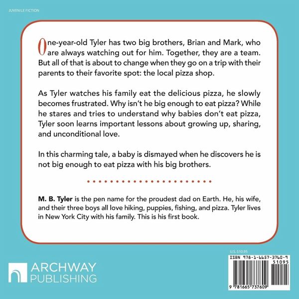 One-year-old Tyler has two big brothers, Brian and Mark, who are always watching out for him. Together, they are a team. But all of that is about to change when they go on a trip with their parents to their favorite spot: the local pizza shop. As Tyler watches his family eat the delicious pizza, he slowly becomes frustrated. Why isn't he big enough to eat pizza? While he stares and tries to understand why babies don't eat pizza, Tyler soon learns important lessons about growing up, sharing, and unconditional love. In this charming tale, a baby is dismayed when he discovers he is not big enough to eat pizza with his big brothers.