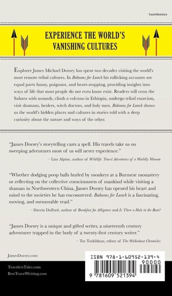 James Michael Dorsey is an award-winning author and explorer who has traveled in 48 countries to visit remote cultures before they vanish. He has written for LONELY PLANET, BBC TRAVEL, BBC WILDLIFE, GEOGRAPHIC EXPEDITIONS, Chicken SOUP FOR THE SOUL, and is a frequent contributor to UNITED AIRLINES¿ HEMISPHERE and PERCEPTIVE TRAVEL. He has also written for COLLIERS, The CHRISTIAN SCIENCE MONITOR, LOS ANGELES TIMES, WEND, NATURAL HISTORY, and GONOMAD. He writes for numerous African magazines, and is a travel consultant to BROWN&HUDSON of London, and correspondent for CAMERAPIX INTERNATIONAL of Nairobi. He is the author of VANISHING TALES FROM ANCIENT TRAILS, and his stories have appeared in 18 anthologies, including THE BEST TRAVEL WRITING volumes 10 and 11, plus the 2016 Lonely Planet Travel Anthology. He has won the grand prize for best travel writing from the Solas Awards, and other awards from TRANSITIONS ABROAD and NOWHERE MAGAZINE. He is a fellow of the Explorers Club and former director of the Adventurers Club.