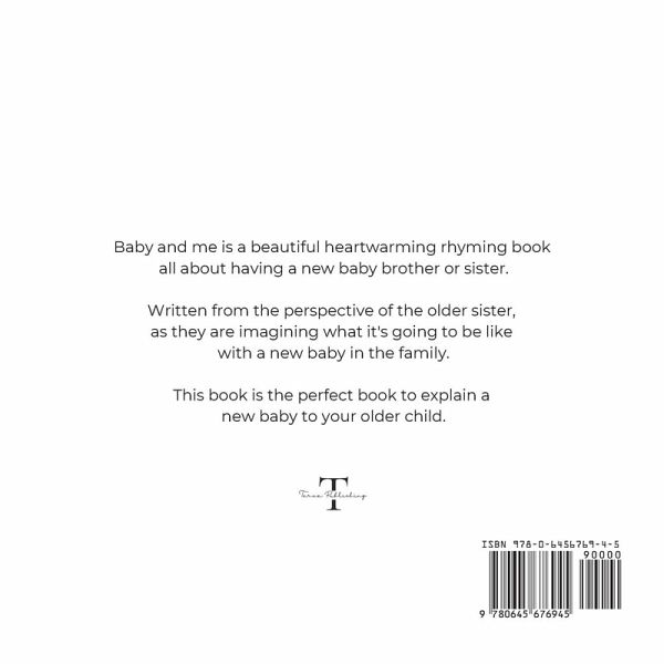 Baby and me is a beautiful heartwarming rhyming book all about having a new baby brother or sister. Written from the perspective of the older sister, as they are imagining what it's going to be like with a new baby in the family. This book is the perfect book to explain a new baby to your older child. "My babies very tiny, little fingers, little toes. I think they have my ears, They also have my nose." 8.5" x 8.5" Paperback 26 pages