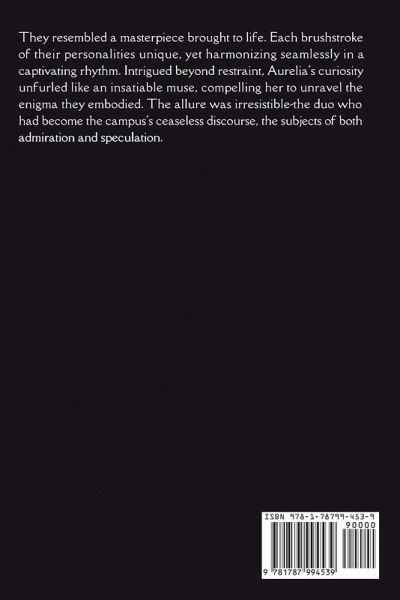 They resembled a masterpiece brought to life. Each brushstroke of their personalities unique, yet harmonizing seamlessly in a captivating rhythm. Intrigued beyond restraint, Aurelia's curiosity unfurled like an insatiable muse, compelling her to unravel the enigma they embodied. The allure was irresistible-the duo who had become the campus's ceaseless discourse, the subjects of both admiration and speculation.
