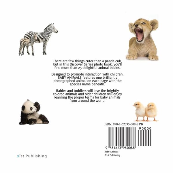 Discover Series Books for Babies & Toddlers There are few things cuter than a panda cub, but in this Discover Series photo book, you'll find more than 25 delightful animal babies. Designed to promote interaction with children, BABY ANIMALS features one brilliantly photographed animal on each page with the species name beneath. Babies and toddlers will love the brightly colored animals and older children will enjoy learning the proper terms for baby animals from around the world.