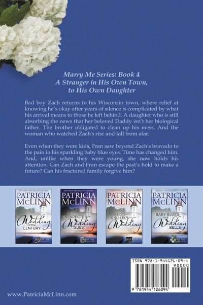 A stranger in his own town, to his own daughterWhen the bad boy of Tobias, Wisconsin, returns home, the repercussions reach far and deep. Handsome and charming Zach Corbett left the small town eight years ago to make his own way... and never looked back. Not at the pregnant ex-girlfriend he left behind. Or at what his departure might mean for his brother Steve, whose wedding was put on hold to raise a baby. Tensions are high, and there's only one person who might be able to redeem the Corbetts' troubled family reunion, a woman who has truly seen Zach since they were kids. Fran Dalton has always seen beyond the bravado to the pain in those beautiful baby blues of Zach's. Now, she can see he's different. And, unlike when they were kids, now she's grabbed his attention. If only she can draw Zach into a loving relationship, and prove how much he's changed, his fractured family might just find it in their hearts to forgive. And heal.Can Zach and Fran escape the past's hold to make a future? Baby Blues and Wedding Bells, Book 4 of USA Today bestselling author Patricia McLinn's Marry Me series, is a moving, passionate contemporary romance that will captivate fans you. Praise for Baby Blues and Wedding Bells"The characters are complex, their hurts seem genuine and the strong, credible conflicts aren't miraculously solved." -- Romantic Times"Zach and Fran are marvelously drawn characters. ... A 'must read' along with the other three books in the series." -- Romance Junkies"Zach and Fran seem like total opposites, but the chemistry between them is spectacular." . -- Fresh Fiction "Superbly gratifying." -- CataRomance ReviewsPraise for the Marry Me series"With her two latest books set in a perfectly realized and perfectly charming small town, McLinn has created two beautifully written, richly emotional love stories that are a joy to read." - John Charles, American Library Association"Gifted Patricia McLinn has written another wonderful series filled with emotion and romance." -- CataRomance Reviews"McLinn has done a marvelous job creating the stories in this series." -- Fresh Fiction Get all the books in Patricia McLinn's Marry Me series Wedding of the CenturyThe Unexpected Wedding GuestA Most Unlikely Wedding Baby Blues and Wedding Bells And if you like Patricia's small-town romance stories, try her Seasons in a Small Town series What Are Friends For? (Spring)The Right Brother (Summer)Falling for Her (Autumn)Warm Front (Winter)