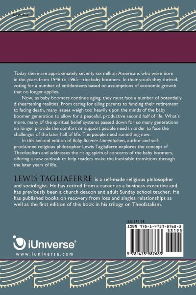 Today there are approximately seventy-six million Americans who were born in the years from 1946 to 1965-the baby boomers. In their youth they thrived, voting for a number of entitlements based on assumptions of economic growth that no longer applies. Now, as baby boomers continue aging, they must face a number of potentially disheartening realities. From caring for ailing parents to funding their retirement to facing death, many issues weigh too heavily upon the minds of the baby boomer generation to allow for a peaceful, productive second half of life. What's more, many of the spiritual belief systems passed down for so many generations no longer provide the comfort or support people need in order to face the challenges of the later half of life. The people need something new. In this second edition of Baby Boomer Lamentations, author and self-proclaimed religious philosopher Lewis Tagliaferre explores the concept of Theofatalism and addresses the rising spiritual concerns of the baby boomers, offering a new outlook to help readers make the inevitable transitions through the later years of life.