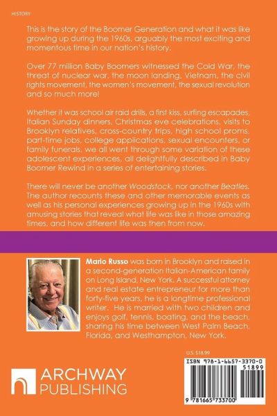This is the story of the Boomer Generation and what it was like growing up during the 1960s, arguably the most exciting and momentous time in our nation's history. Over 77 million Baby Boomers witnessed the Cold War, the threat of nuclear war, the moon landing, Vietnam, the civil rights movement, the women's movement, the sexual revolution and so much more! Whether it was school air raid drills, a first kiss, surfing escapades, Italian Sunday dinners, Christmas Eve celebrations, visits to Brooklyn relatives, cross-country trips, high school proms, part-time jobs, college applications, sexual encounters, or family funerals, we all went through some variation of these adolescent experiences, all delightfully described in Baby Boomer Rewind in a series of entertaining stories. There will never be another Woodstock, nor another Beatles. The author recounts these and other memorable events as well as his personal experiences growing up in the 1960s with amusing stories that reveal what life was like in those amazing times, and how different life was then from now.