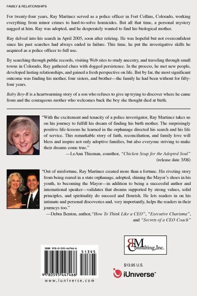 For twenty-four years, Ray Martinez served as a police officer in Fort Collins, Colorado, working everything from minor crimes to hard-to-solve homicides. But all that time, a personal mystery nagged at him. Ray was adopted, and he desperately wanted to find his biological mother. Ray delved into his search in April 2005, soon after retiring. He was hopeful but not overconfident since his past searches had always ended in failure. This time, he put the investigative skills he acquired as a police officer to full use. By searching through public records, visiting Web sites to study ancestry, and traveling through small towns in Colorado, Ray gathered clues with dogged persistence. In the process, he met new people, developed lasting relationships, and gained a fresh perspective on life. But by far, the most significant outcome was finding his mother, four sisters, and brother-the family he had been without for fifty-four years. Baby Boy-R is a heartwarming story of a son who refuses to give up trying to discover where he came from and the courageous mother who welcomes back the boy she thought died at birth.