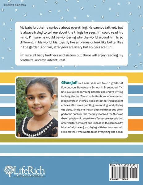 My baby brother is curious about everything. He cannot talk yet, but is always trying to tell me about the things he sees. If I could read his mind, I'm sure he would be wondering why the world around him is so different. In his world, his toys fly like airplanes or look like butterflies in the garden. For him, strangers are scary but spiders are fun! I'm sure all baby brothers and sisters out there will enjoy reading my brother's, and my, adventures!