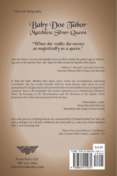 Elizabeth Bonduel McCourt was born in 1854 in Wisconsin. She moved west, married a man named Harvey Doe, and came to be called "Baby" by the miners in Central City, Colorado. After attracting the attention of wealthy Horace Tabor of Leadville, she began a very public affair with Tabor ending with marriage in a private ceremony in 1882. A lavish lifestyle ended after fifteen years with loss of the Tabor fortune in the Silver Crash and Horace's death in 1899. Baby Doe spent the last thirty-five years of her life in a small cabin outside the Matchless Mine in Leadville.