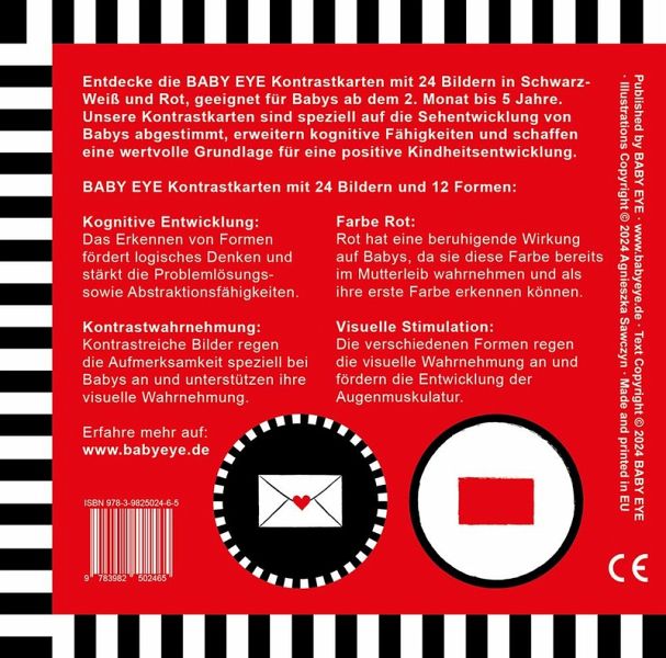 Entdecke die BABY EYE Kontrastkarten mit 24 Bildern in Schwarz-Weiß und Rot, geeignet für Babys ab dem 2. Monat bis 5 Jahre. Unsere Kontrastkarten sind speziell auf die Sehentwicklung von Babys abgestimmt, erweitern kognitive Fähigkeiten und schaffen eine wertvolle Grundlage für eine positive Kindheitsentwicklung. Jedes Bild hat einen Rand, der besonders wichtig für die Fokussierung ist.Kognitive Entwicklung: Das Erkennen von Formen fördert logisches Denken und stärkt die Problemlösungs- sowie Abstraktionsfähigkeiten.Kontrastwahrnehmung: Kontrastreiche Bilder regen die Aufmerksamkeit speziell bei Babys an und unterstützen ihre visuelle Wahrnehmung.Farbe Rot: Rot hat eine beruhigende Wirkung auf Babys, da sie diese Farbe bereits im Mutterleib wahrnehmen und als ihre erste Farbe erkennen können.Visuelle Stimulation: Die verschiedenen Formen regen die visuelle Wahrnehmung an und fördern die Entwicklung der Augenmuskulatur.Alle BABY EYE Kontrastkarten und Kontrastbücher werden in Europa gedruckt, sind schadstofffrei und robust.Gedruckt in der EU, hergestellt aus stabilem Karton. Spezielle, schützende Beschichtung. Schadstofffrei, nachhaltig und robust.