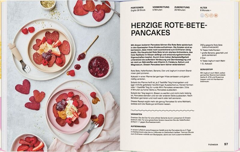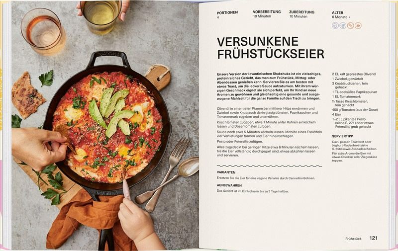 Ein Highlight des Buches sind die über 100 familienfreundlichen Rezepte, die sich durch ihre Einfachheit und Vielseitigkeit auszeichnen. Von Frühstücksideen bis hin zu Abendessen – jedes Gericht ist so gestaltet, dass es den Bedürfnissen der Kleinsten entspricht, aber auch Erwachsenen schmeckt. Klassiker wie Käsenudeln oder süße Leckereien wie Nutella werden in gesunden, kindgerechten Varianten präsentiert.