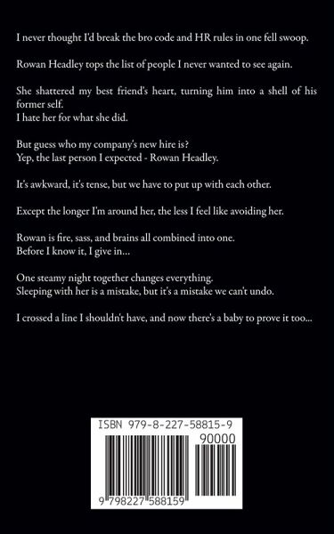 I never thought I'd break the bro code and HR rules in one fell swoop. Rowan Headley tops the list of people I never wanted to see again. She shattered my best friend's heart, turning him into a shell of his former self. I hate her for what she did. But guess who my company's new hire is? Yep, the last person I expected - Rowan Headley. It's awkward, it's tense, but we have to put up with each other. Except the longer I'm around her, the less I feel like avoiding her. Rowan is fire, sass, and brains all combined into one. Before I know it, I give in... One steamy night together changes everything. Sleeping with her is a mistake, but it's a mistake we can't undo. I crossed a line I shouldn't have, and now there's a baby to prove it too...