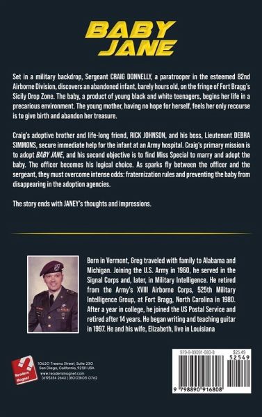 Set in a military backdrop, Sergeant CRAIG DONNELLY, a paratrooper in the esteemed 82nd Airborne Division, discovers an abandoned infant, barely hours old, on the fringe of Fort Bragg's Sicily Drop Zone. The baby, a product of young black and white teenagers, begins her life in a precarious environment. The young mother, having no hope for herself, feels her only recourse is to give birth and abandon her treasure. Craig's adoptive brother and life-long friend, RICK JOHNSON, and his boss, Lieutenant DEBRA SIMMONS, secure immediate help for the infant at an Army hospital. Craig's primary mission is to adopt BABY JANE, and his second objective is to find Miss Special to marry and adopt the baby. The officer becomes his logical choice. As sparks fly between the officer and the sergeant, they must overcome intense odds: fraternization rules and preventing the baby from disappearing in the adoption agencies. The story ends with JANEY's thoughts and impressions.