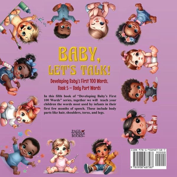 "Let's Talk! Developing Baby's First 100 Words" helps parents guide children in developing their vocabulary for the most common 100 words babies first speak. In this fifth book of my "Developing Baby's First 100 Words" series, together we will teach your children the words most used by infants in their first few months of speech. These include body parts like hair, shoulders, torso, and legs.