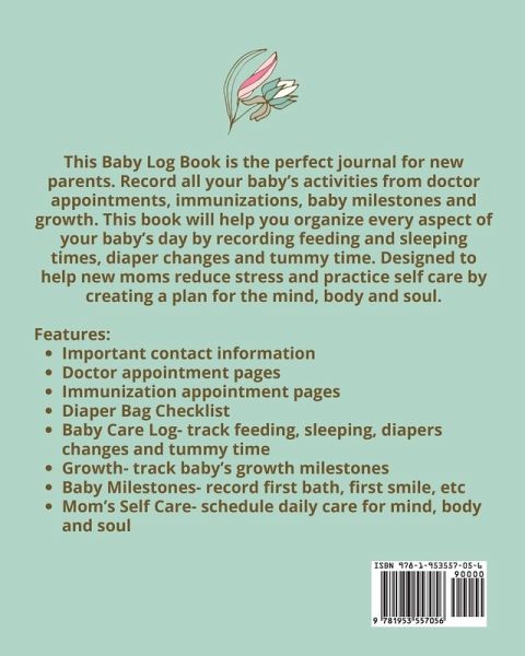 This Baby Log Book is the perfect journal for new parents. Record all your baby's activities from doctor appointments, immunizations, baby milestones, and growth. This book will help you organize every aspect of your baby's day by recording feeding and sleeping times, diaper changes, and tummy time. Designed to help new moms reduce stress and practice self-care by creating a plan for the mind, body, and soul. Features:Important contact information Doctor appointment pages Immunization appointment pages Diaper Bag Checklist Baby Care Log- track feeding, sleeping, diapers changes, and tummy time Growth- track baby's growth milestones Baby Milestones- record first bath, first smile, etc Mom's Self Care- schedule daily care for mind, body, and soul Details:Pages- 104 Size- 8" x 10" Paperback Matte finish Awesome baby announcement and shower gift. First times moms will love this book. Makes a great gift for anyone who wants to track and record their baby's daily activities. Order this great logbook for yourself or make this the perfect gift for family and friends.