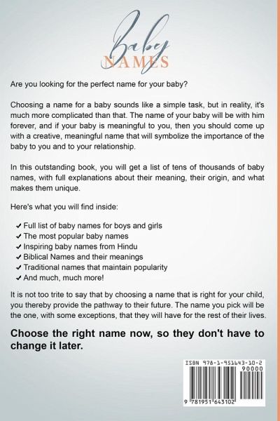 *** Triple 3 in 1 Book - Baby Names for Boys and Girls Include Unisex Names *** Are you looking for the perfect name for your baby? Choosing a name for a baby sounds like a simple task, but in reality, it's much more complicated than that. The name of your baby will be with him forever, and if your baby is meaningful to you, then you should come up with a creative, meaningful name, that will symbolize the importance of the baby to you and to your relationship. In this outstanding book, with 400+ pages , you will get a list of tens of thousands of baby names, with full explanations about their meaning, their origin, and what makes them unique. Here's what you will find inside: 1. Full list of baby names for boys & girls 2. The most popular baby names 3. The meanings of names and their origins 4. Inspiring baby names from Hindu 5. Traditional names that maintain popularity 6. And much, much more... It is not too trite to say that by choosing a name that is right for your child you thereby provide the pathway to their future. The name you pick will be the one, with some exceptions, that they will have for the rest of their lives. Choose the right name now, so they don't have to change it later.